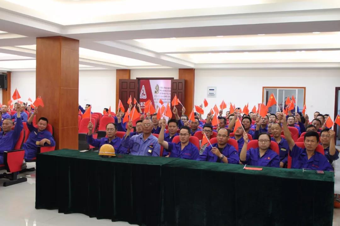2019年10月1日上午,三寶集團(tuán)中高層領(lǐng)導(dǎo)、全體黨員、各部門各分廠員工代表共300余人在升旗臺(tái)前隆重集會(huì),由黨委書記林軍主持,舉行迎國慶升國旗儀式。