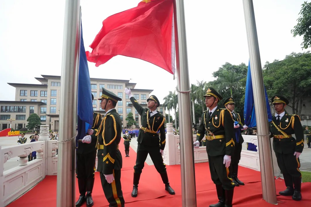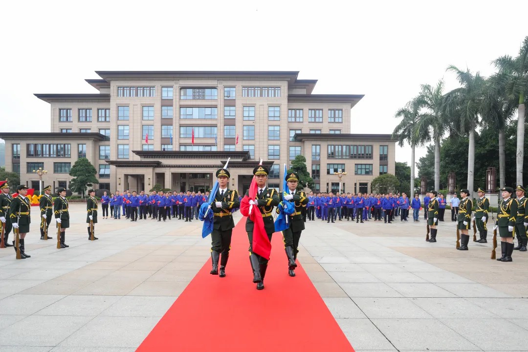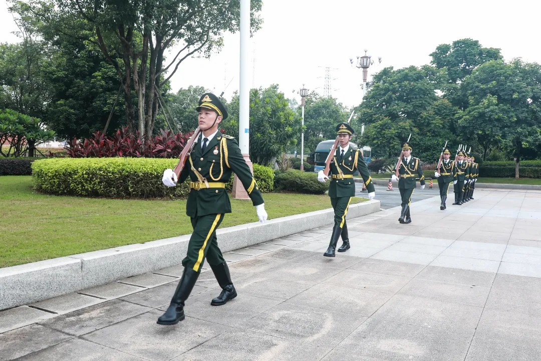 上午8點,黨委書記林軍宣布升國旗儀式正式開始。儀仗隊和護旗手邁著堅定有力的步伐護送國旗行進至旗臺,伴隨著雄壯的《義勇軍進行曲》,鮮艷的五星紅旗冉冉升起,參加儀式的全體人員向國旗莊嚴敬禮。