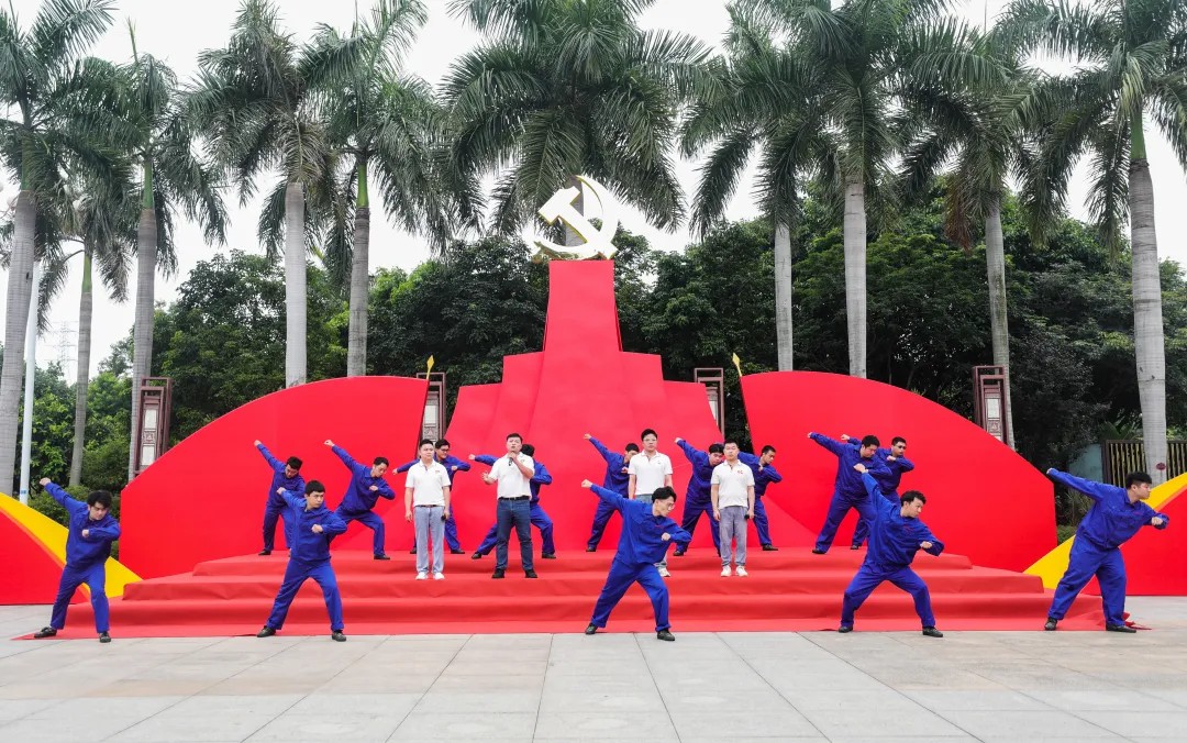 升旗儀式后,舉行了集團慶祝中國共產(chǎn)黨建黨102周年廣場表演,歌舞《唱支山歌給黨聽》《眾人劃獎開大船》《我們都是追夢人》和國旗護衛(wèi)隊大合唱《走向復興》讓大家耳目一新,聲聲鏗鏘有力的誓言響徹天空,充分表達了對黨忠誠的堅定信念。集團掌舵人王光文董事長還帶領大家再次唱響《眾人劃槳開大船》,展示了“團結拼搏、追求卓越”三寶人的精神風貌,在場的每位員工熱血沸騰。