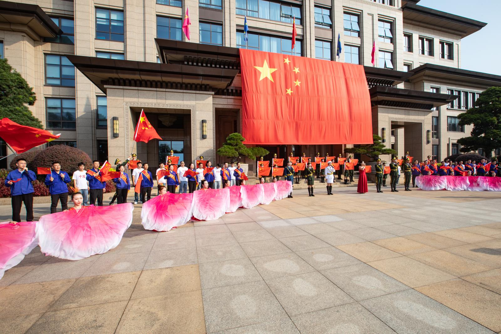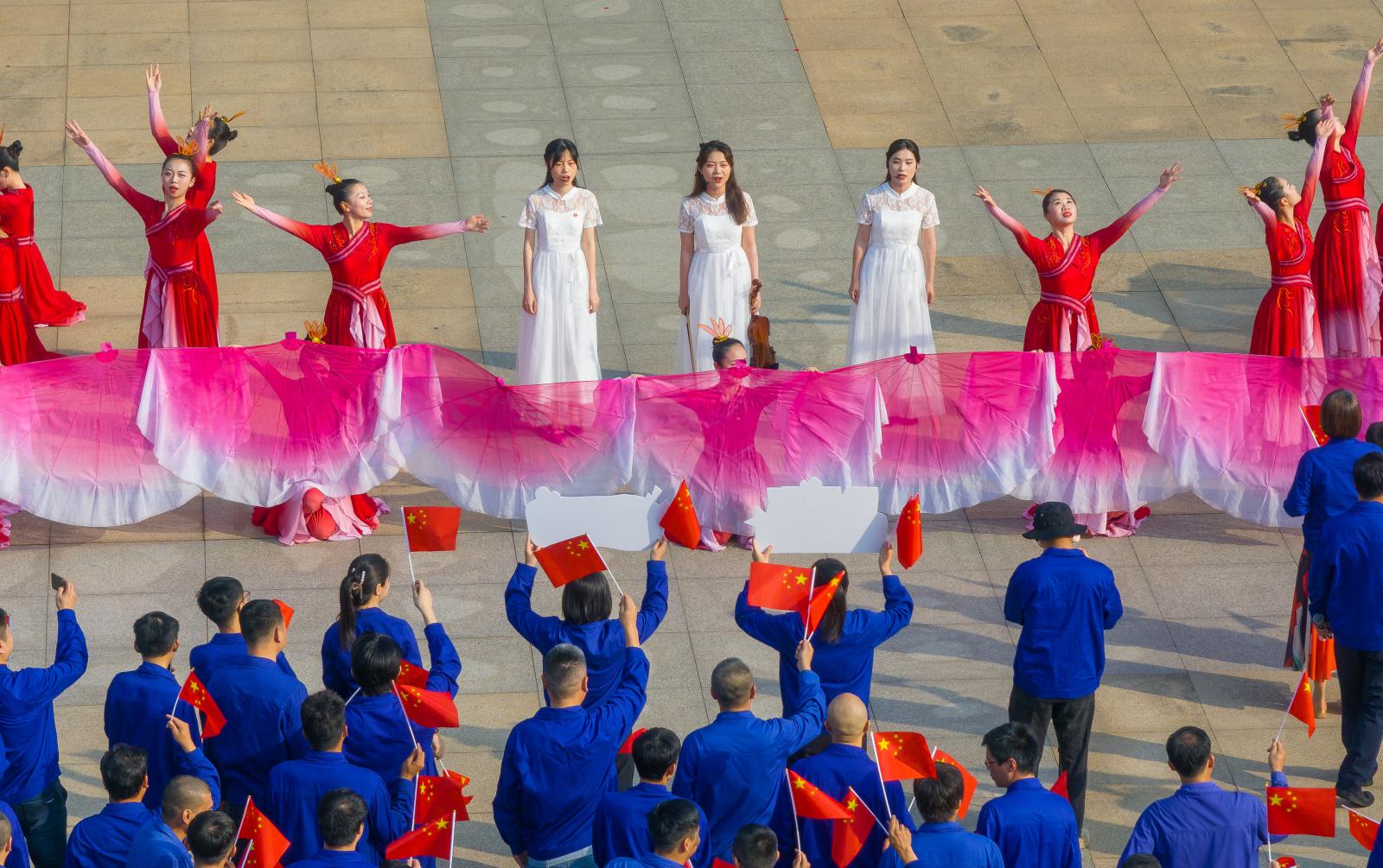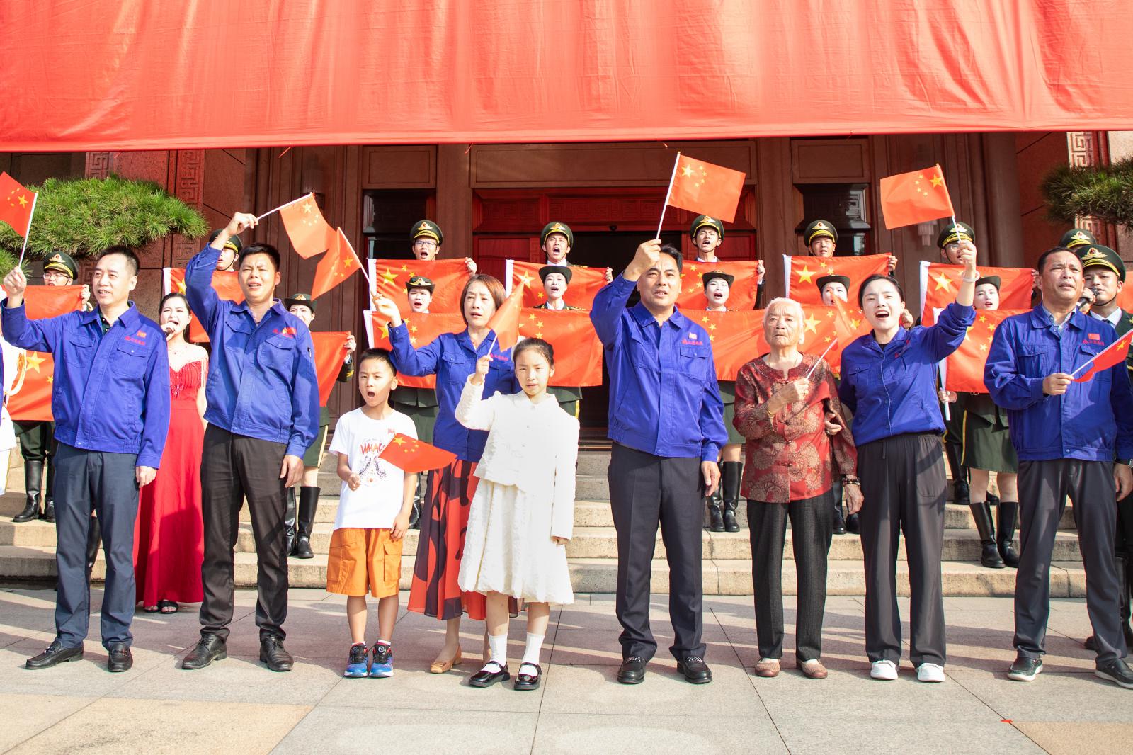 上午8時(shí),升旗儀式正式開始,伴隨著國(guó)旗護(hù)衛(wèi)隊(duì)雄壯的腳步和激昂的國(guó)歌聲,鮮艷的五星紅旗迎著旭日冉冉升起,大家面向國(guó)旗肅立行禮,向國(guó)旗致以最崇高的敬意。緊接著,伴隨著《我和我的祖國(guó)》悠揚(yáng)的小提琴聲音響起,國(guó)慶快閃活動(dòng)正式拉開序幕。三寶各單位代表?yè)]舞著小國(guó)旗,和演員們一起唱響《大中國(guó)》《咱們工人有力量》《紅旗飄飄》,聚集在行政樓廣場(chǎng)的大國(guó)旗下,場(chǎng)上氣氛熱烈、紅旗招展,匯聚起磅礴奮進(jìn)力量,全場(chǎng)大合唱《歌唱祖國(guó)》把活動(dòng)推向高潮,唱出了三寶人對(duì)祖國(guó)的禮贊。