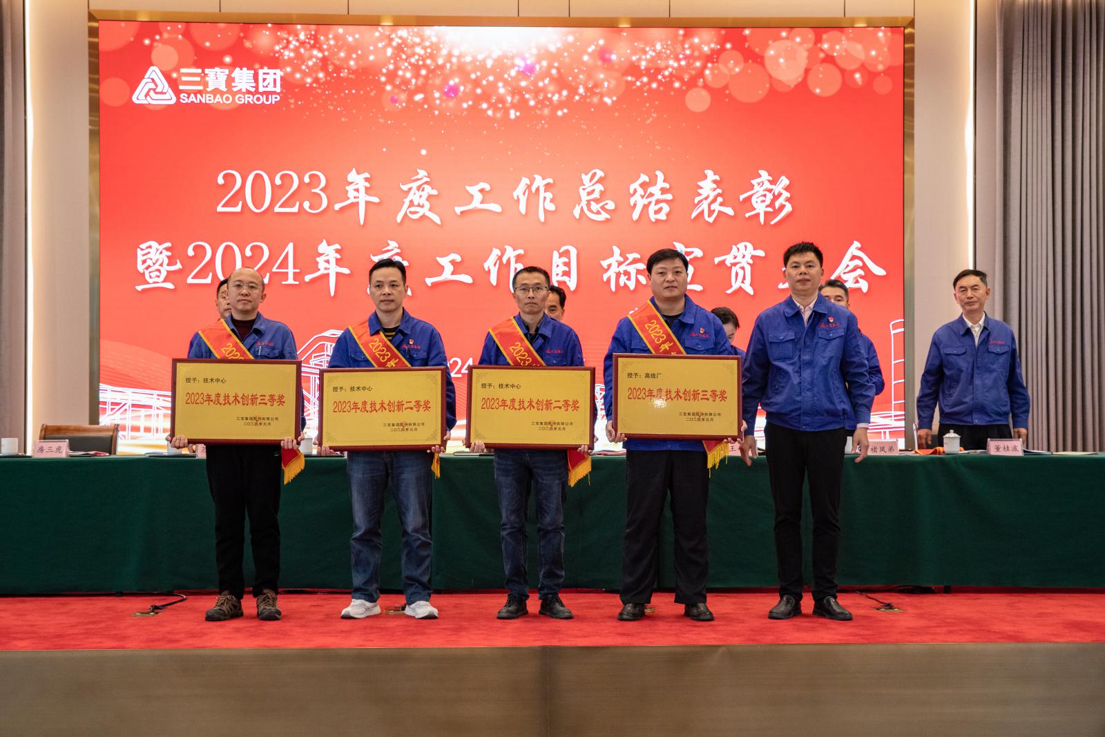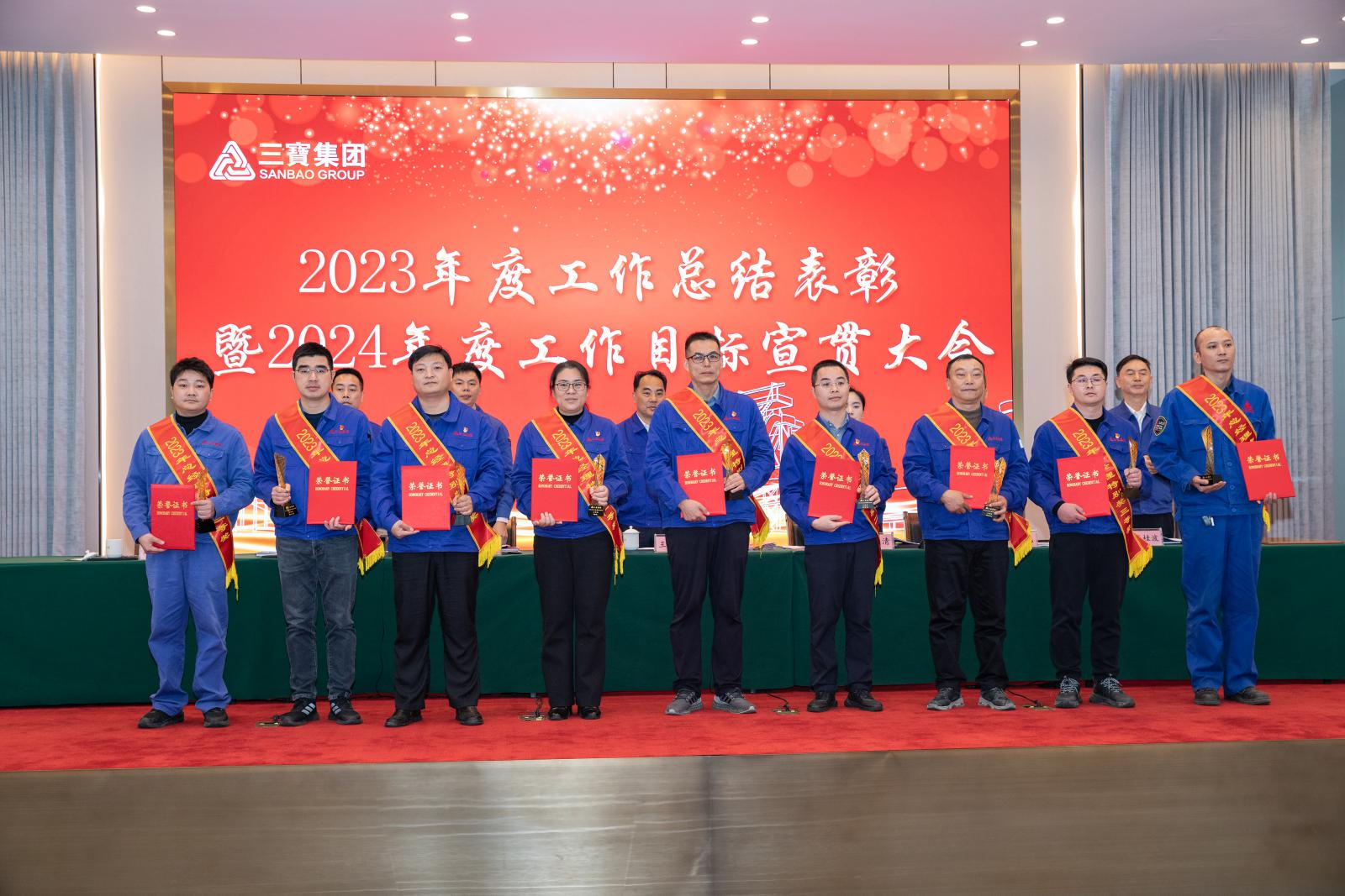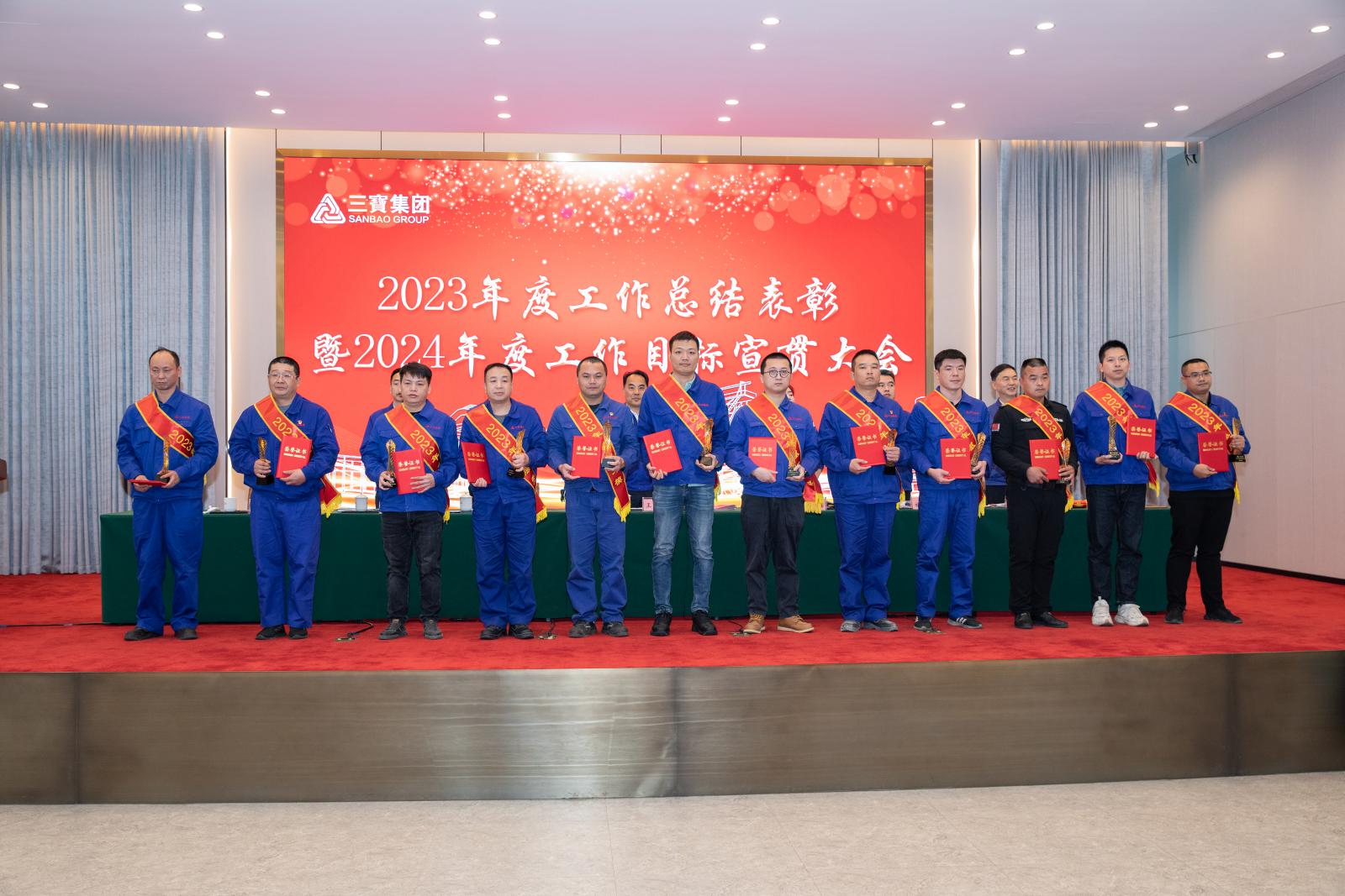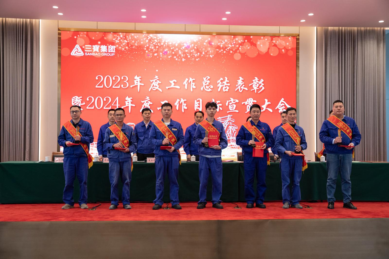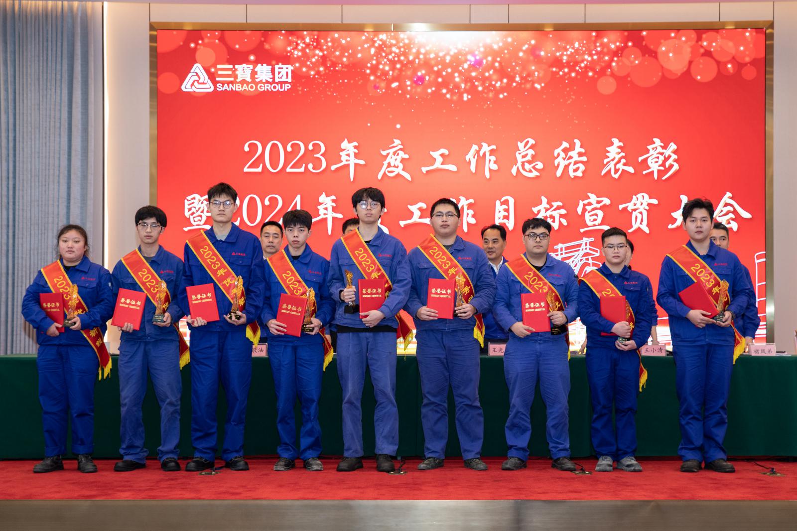副總經(jīng)理褚鳳弟代表集團(tuán)宣讀《三寶集團(tuán)關(guān)于表彰2023年度先進(jìn)單位及個人的決定》,本年度共產(chǎn)生總經(jīng)理特別獎9名,基層勞模49名,先進(jìn)班組27個,優(yōu)秀師傅7名,優(yōu)秀新銳19名;優(yōu)秀項目建設(shè)獎1個,管理創(chuàng)新獎1個,技術(shù)創(chuàng)新獎4個,優(yōu)化提升獎3個。集團(tuán)領(lǐng)導(dǎo)分別為優(yōu)秀單位和個人頒獎。
