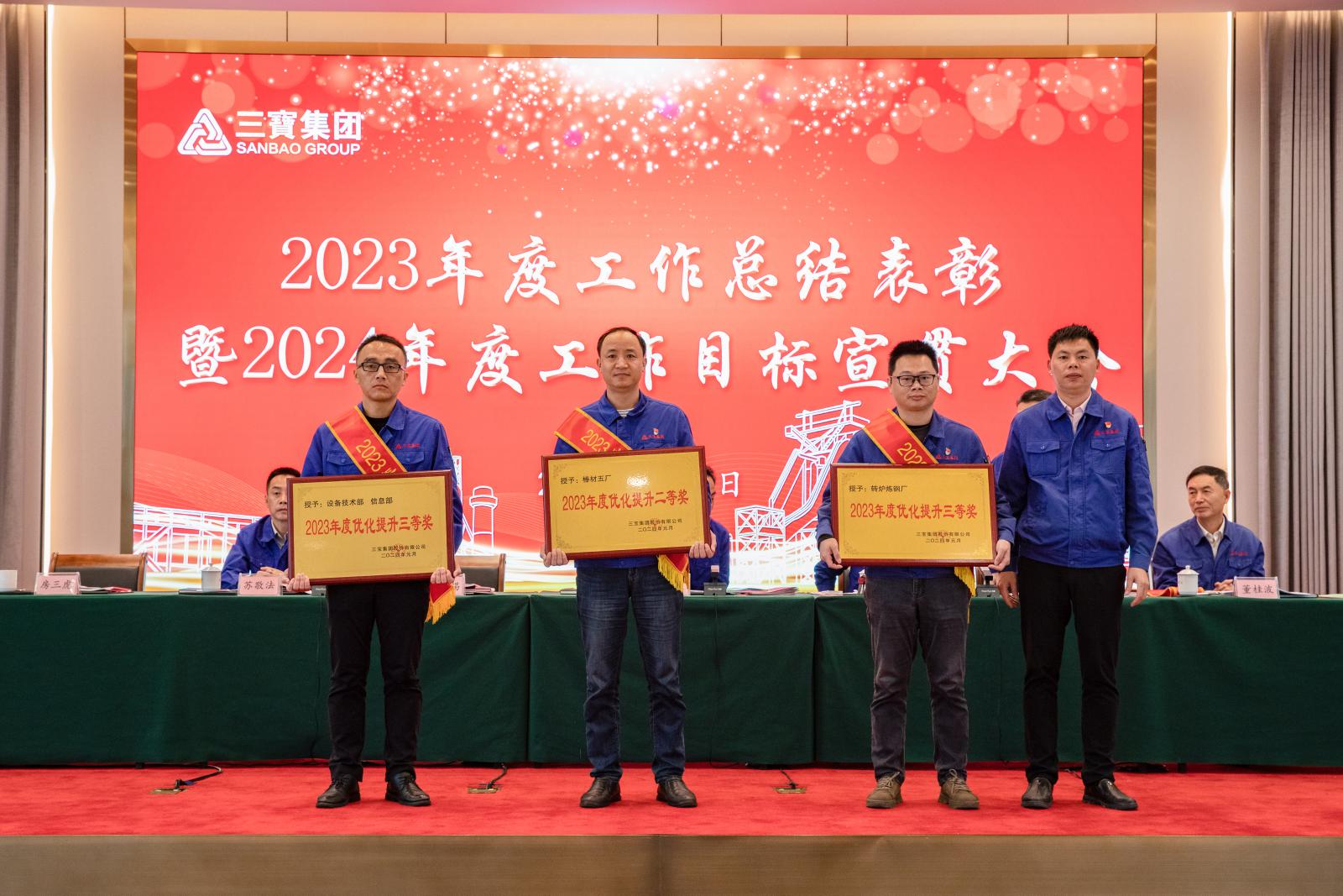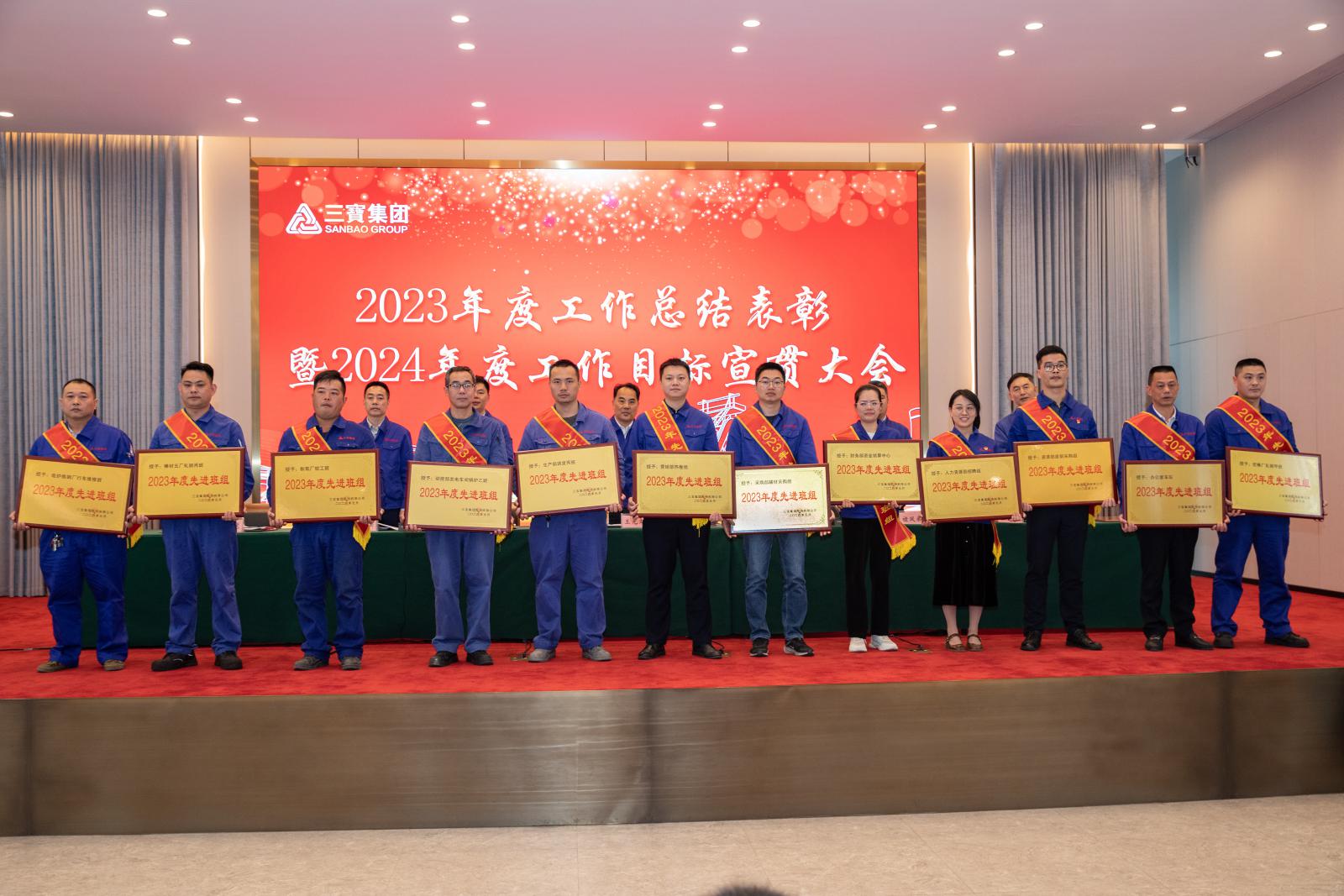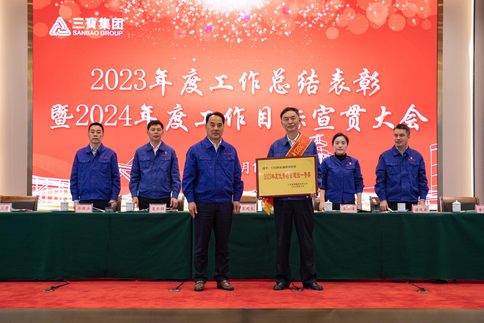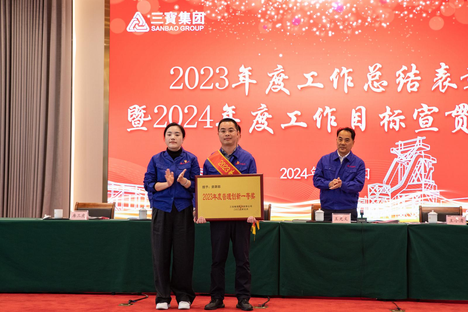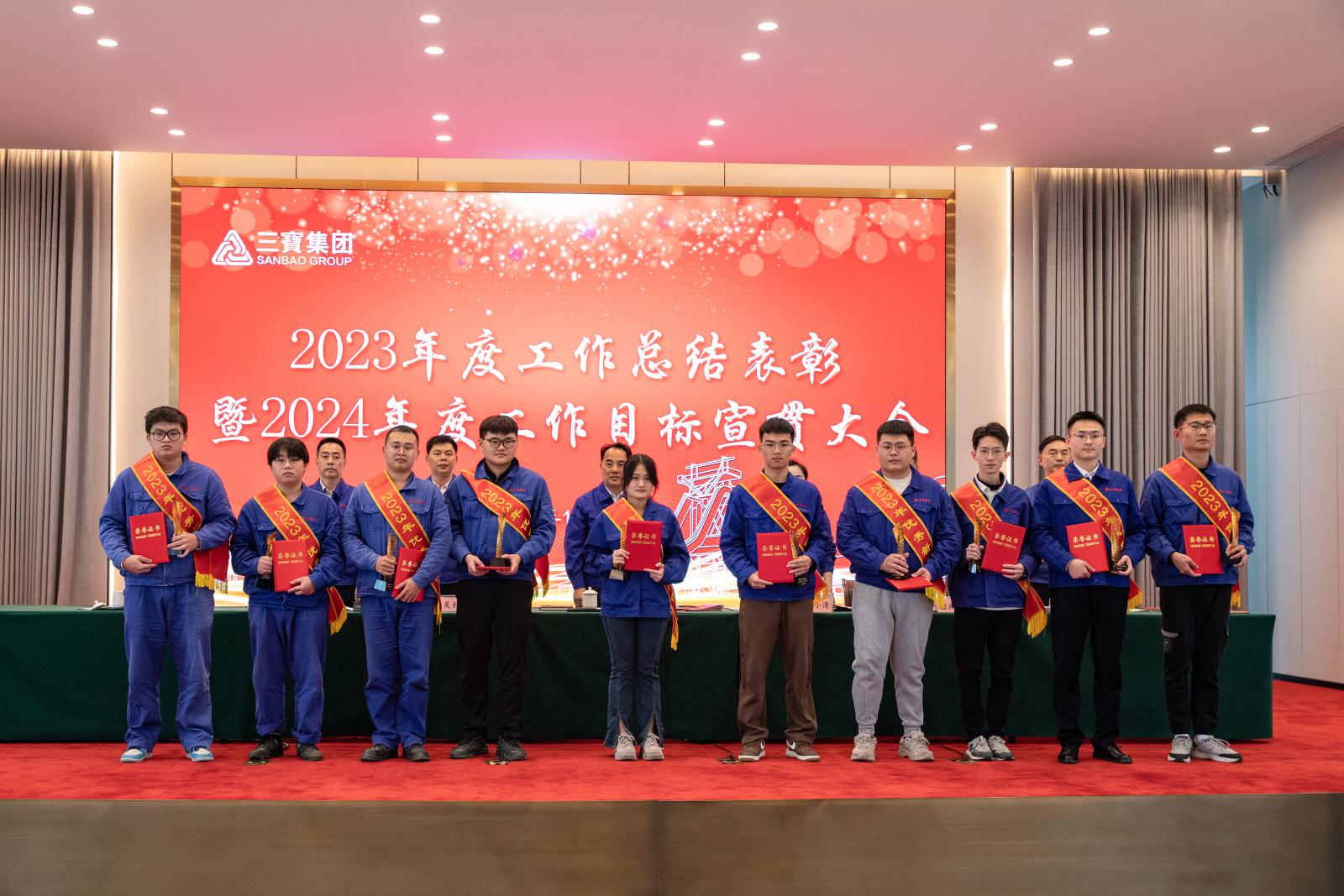 副總經(jīng)理褚鳳弟代表集團(tuán)宣讀《三寶集團(tuán)關(guān)于表彰2023年度先進(jìn)單位及個人的決定》,本年度共產(chǎn)生總經(jīng)理特別獎9名,基層勞模49名,先進(jìn)班組27個,優(yōu)秀師傅7名,優(yōu)秀新銳19名;優(yōu)秀項目建設(shè)獎1個,管理創(chuàng)新獎1個,技術(shù)創(chuàng)新獎4個,優(yōu)化提升獎3個。集團(tuán)領(lǐng)導(dǎo)分別為優(yōu)秀單位和個人頒獎。
