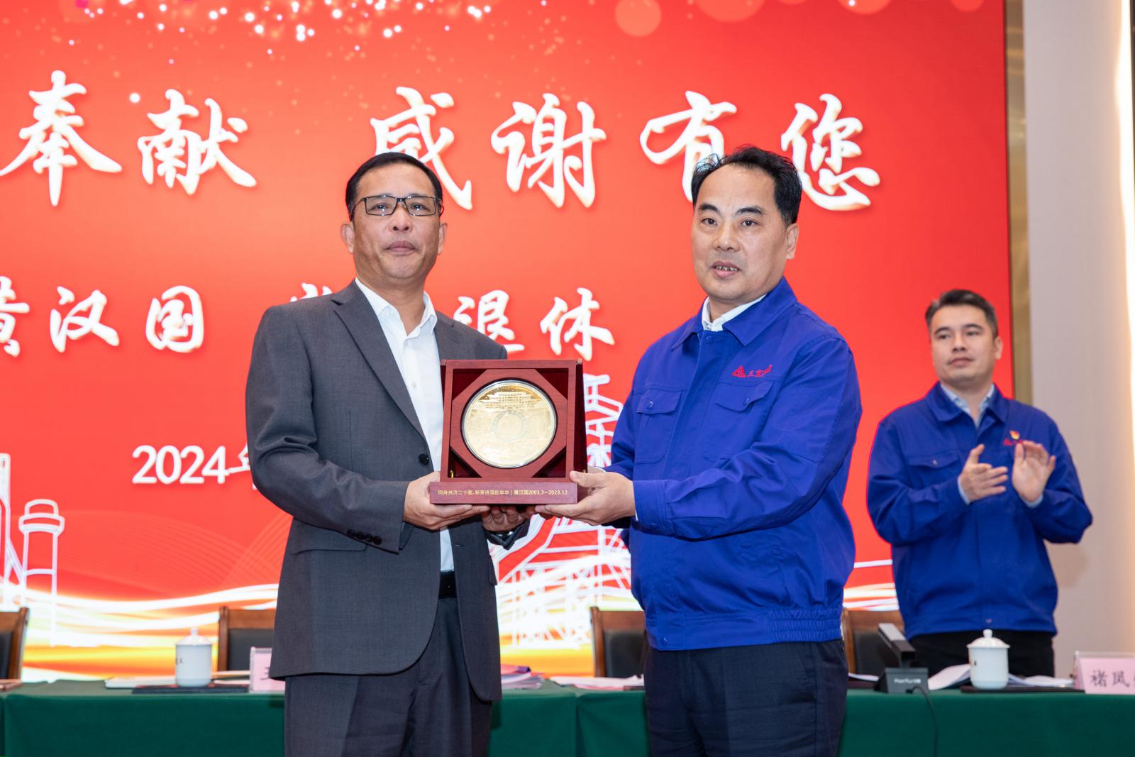 大會舉行集團(tuán)原副總經(jīng)理黃漢國光榮退休儀式。王董事長為黃漢國頒發(fā)光榮退休紀(jì)念金牌,感謝他二十多年來對集團(tuán)的無私奉獻(xiàn)。